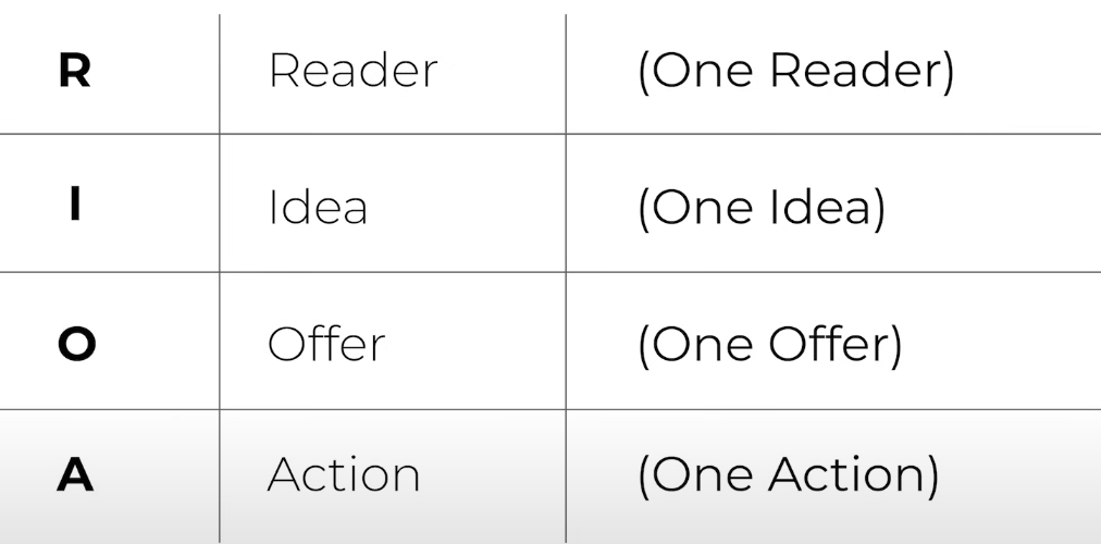 Before I write anything, whether it’s a landing page or a blog post, I use the RIOA method to plan my approach.