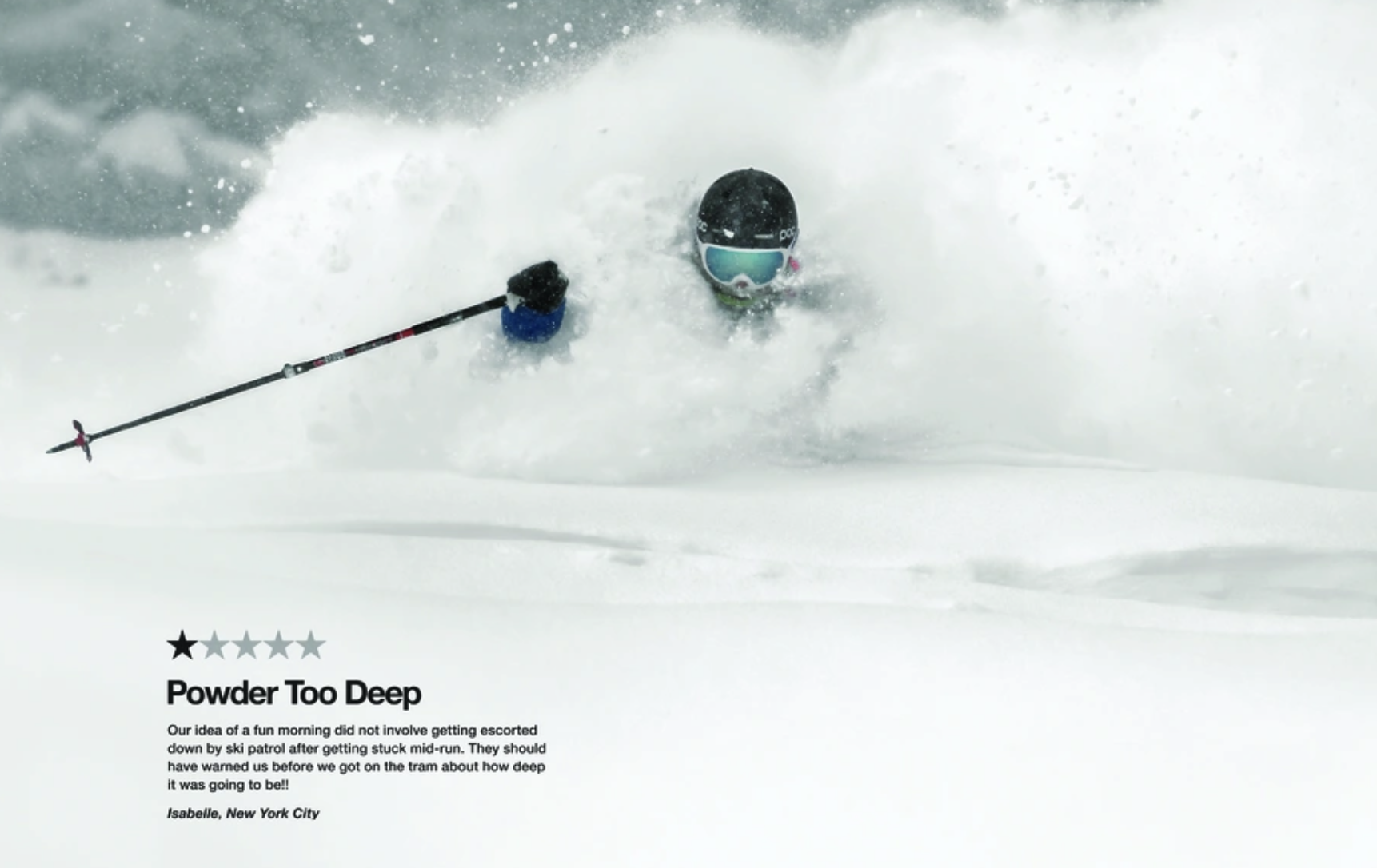 This ad is part of Snowbird’s “One-Star Reviews” campaign, which cleverly turned negative reviews into a badge of honor for experienced skiers.