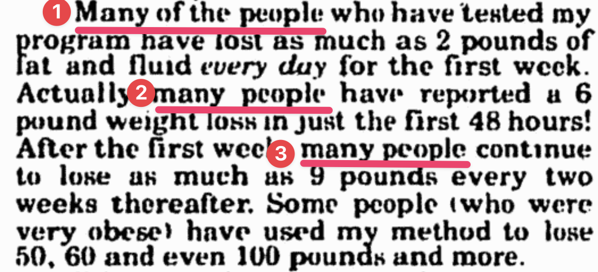 Check out the paragraph below, where the author mentions multiple times how “many people” tested the program and experienced significant results.