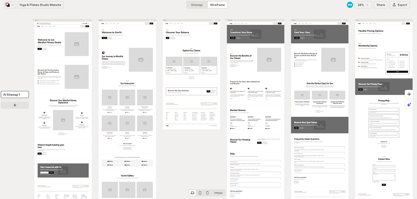 Relume automatically creates wireframes from the sitemap.