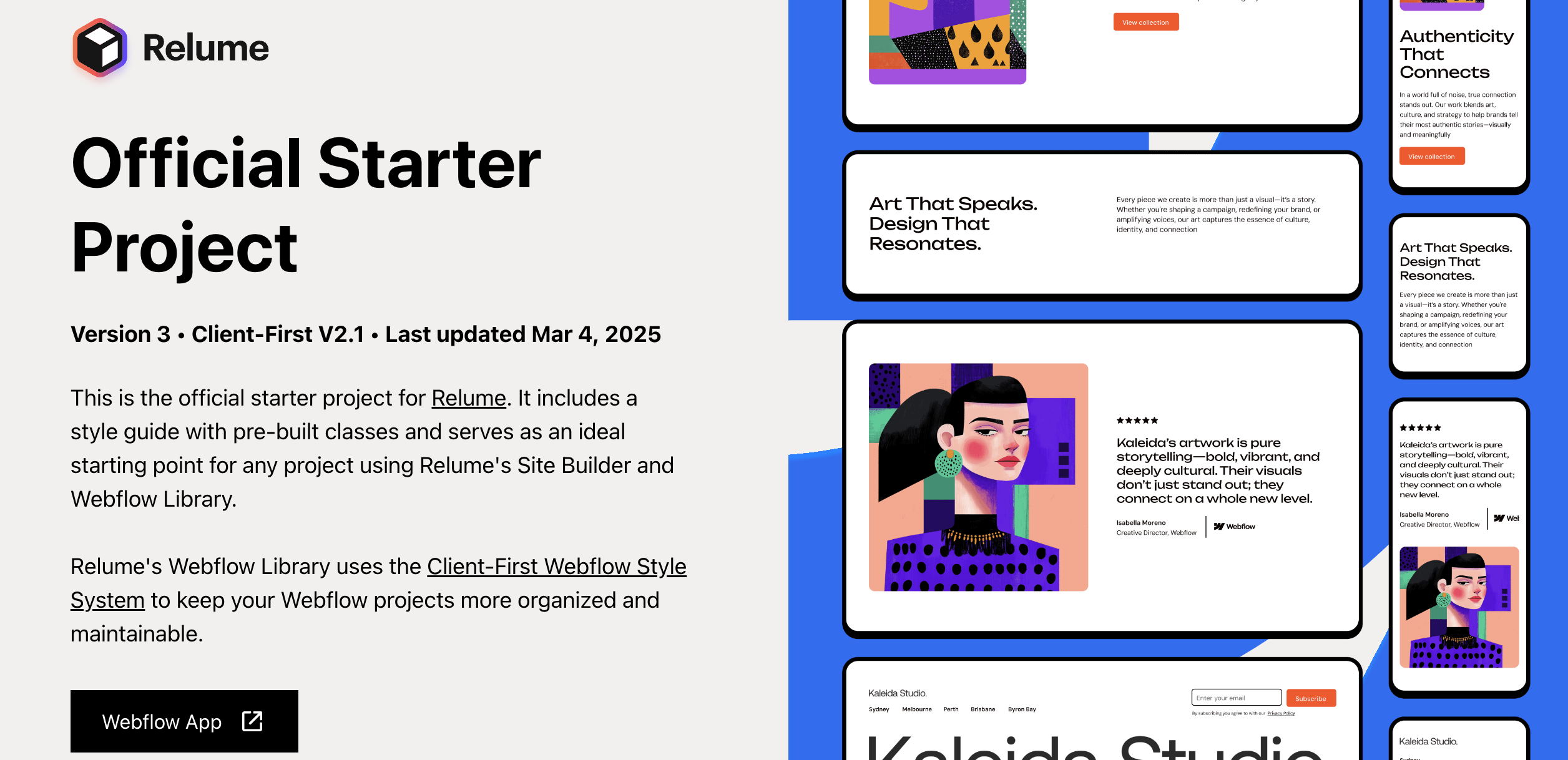 On Webflow, I first export Relume’s Starter Project, because it includes a great style guide and built-in classes with the Client-First system.